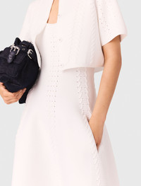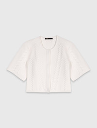 Cropped cardigan This short pointelle knit cardigan, hand-embroidered, combines delicacy and lightness. Its round neck and short sleeves add a touch of softness, while the press-stud fastening allows for easy and elegant adjustment. - Short pointelle knit cardigan - Round neck and short sleeves - Press-stud fastening - Handcrafted lacing - Designed for a cropped fit The model is 5' 9 and wears a size 1. Reference: MFPCA00606_10 Composition & care Main material: 100% polyester Rib: 86% polyester, 12% polyamide, 2% elastane Hand wash Do not bleach Do not tumble dry Iron at a maximum temperature of 110°C without steam F/ - Professional dry clean, with hydrocarbon solvent, gentle treatment