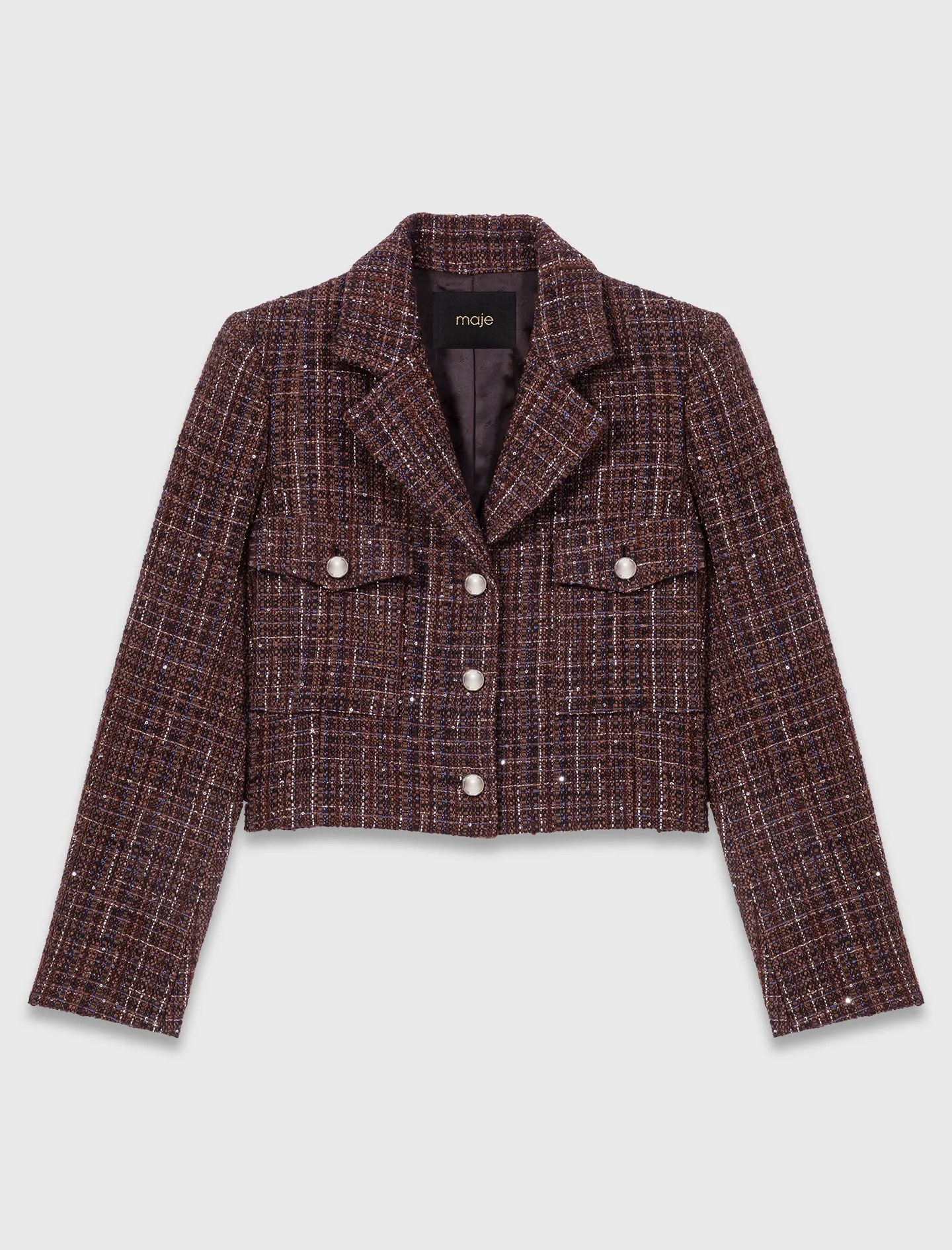 Short tweed jacket The Maje seasonal wardrobe reveals structured pieces with comforting fabrics and impeccable cuts. A subtle play on contrasts between the retro elegance of tweed and the sparkle of sequins. This cropped jacket provides a structured look while gently catching the light. Featuring a lapel collar, chest patch pockets and a button fastening, it charms with its straight cut and assertive look. Pair with the matching shorts and a shirt for a new take on tailoring, and accessorise with a fringed bag and leather loafers. - Cropped sequin tweed jacket - Lapel collar - Button fastening - Chest patch pockets - Designed for a cropped, boxy fit The model is 5' 11 and wears a size 36. Reference: MFPVE00741_G005 Composition & care Main material: 49% cotton, 21% acrylic, 15% polyester, 12% polyamide, 2% viscose, 1% metalized fibers Lining: 100% viscose Do not wash Do not bleach Do not tumble dry Iron at a maximum temperature of 110°C without steam F/ - Professional dry clean, with hydrocarbon solvent, gentle treatment