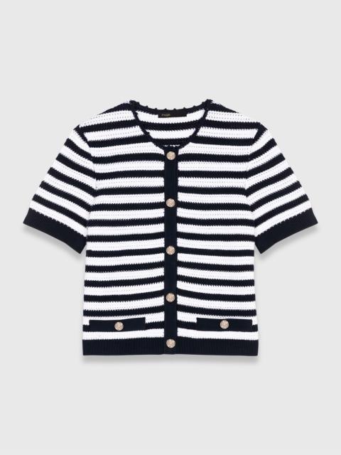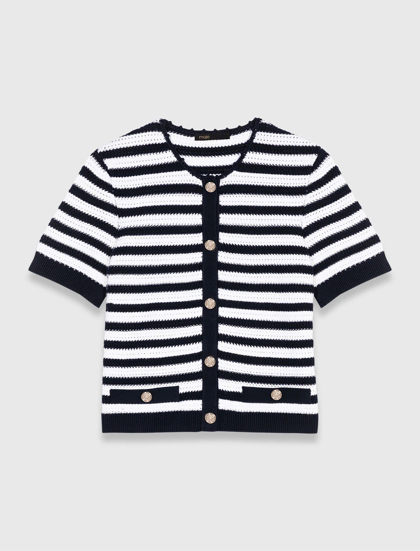 Crochet cropped cardigan This crochet cardigan in two-tone stripes is a stylish reinterpretation of Breton tops. The round neck, short sleeves and ribbed trim create a stylish silhouette. Reference: - Ultra-plush two-tone stripe crochet cardigan - Breton style - Short-sleeved and round-neck - Decorative button fastening - 2 welt pockets - Plain ribbed edges - Hand-crocheted finishes - Designed for a standard fit The model is 5' 10 and wears a size 1. Reference: MFPCA00616_O025 Composition & care Main material: 70% viscose, 30% polyester Rib: 69% viscose, 30% polyester, 1% elastodiene Hand wash Do not bleach Do not tumble dry Iron at a maximum temperature of 110°C without steam F - Professional dry clean, with hydrocarbon solvent, normal treatment