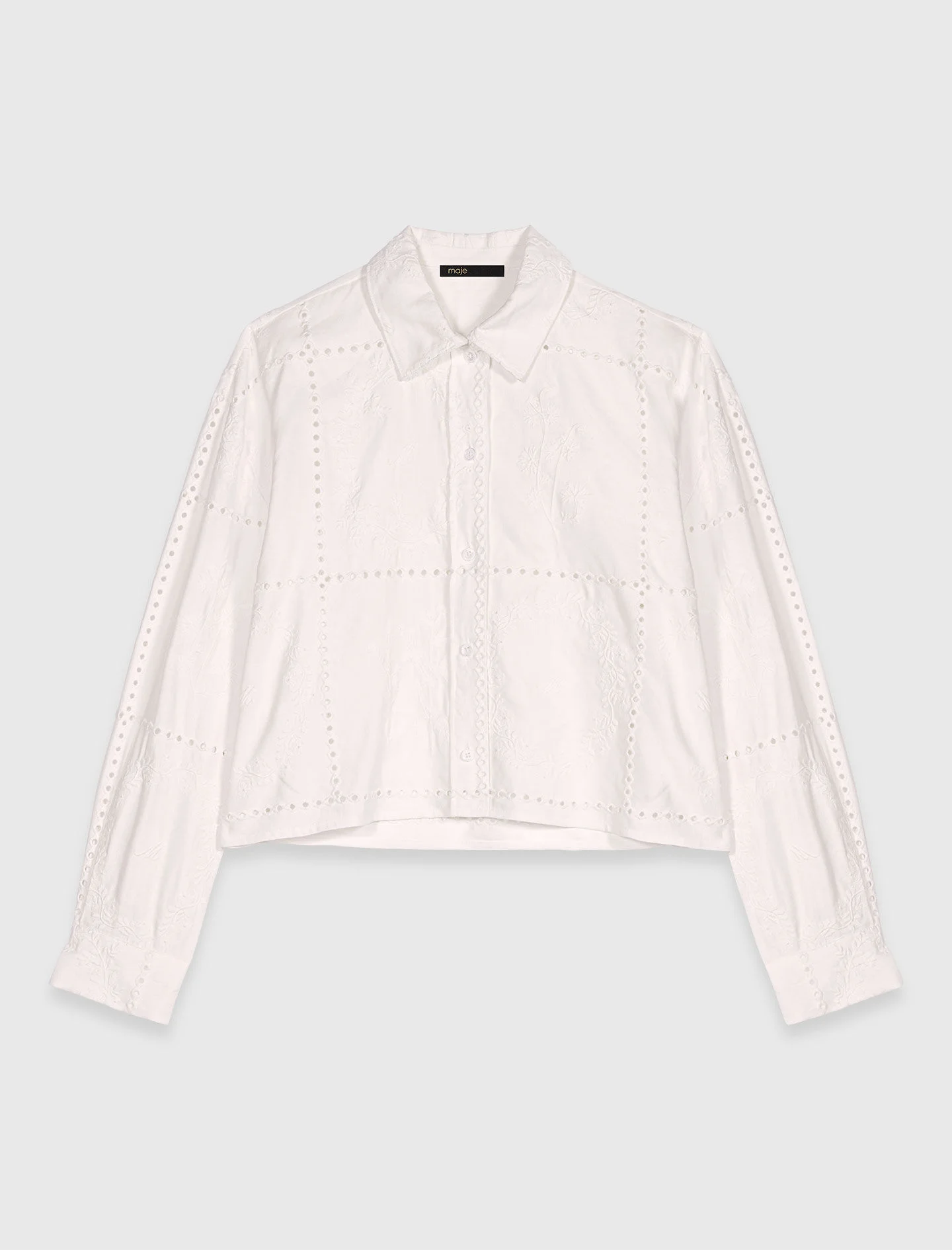 Cropped embroidered shirt Inspired by the end of summer, this collection evokes a woman between Saint-Tropez and Cassis. Between childhood memories and Provencal markets, it combines simplicity and elegance with timeless, lightweight pieces perfect for the transition to autumn. This short linen shirt with floral embroidery combines freshness and elegance. The shirt collar and long sleeves add sophistication, while its longer back and embroidered M signature make it a unique piece full of character. To complete the look, add raw jeans, a statement belt and a signature bag. - Short linen shirt with floral embroidery - Shirt collar - Long sleeves - Button fastening - Longer at the back - Embroidered M signature on front and back - Designed for a standard fit The model is 5' 10 and wears a size 1. Reference: MFPCM00701_10 Composition & care Main material: 54% linen, 46% viscose Buttons: 100% nacre Embroidery: 100% cotton Hand wash Do not bleach Do not tumble dry Iron at a maximum temperature of 110°C without steam F/ - Professional dry clean, with hydrocarbon solvent, gentle treatment