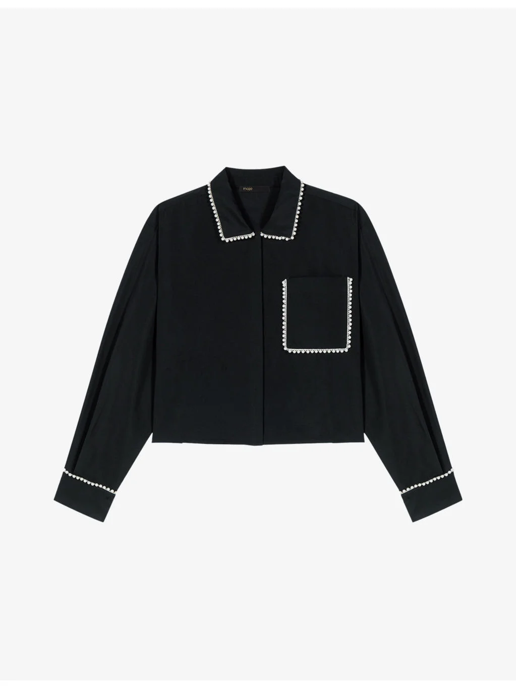 PRODUCT DETAILS - Maje woven shirt - 100% polyester - Concealed button fastenings at front - Boxy fit, classic collar with embroidered trim, patch pocket at chest, long sleeves, cropped, straight hem - Machine wash at 30°C - True to size - Lightweight, non-stretch Ref: R04578903