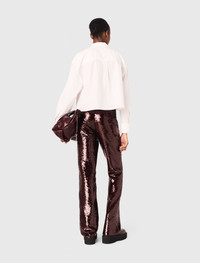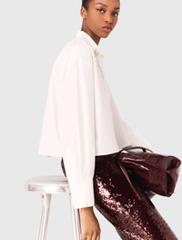 Cropped shirt with jewel detail Continuing the theme of a reimagined preppy wardrobe, the Maje studio designs strong pieces that are both structured and full of character. This short poplin shirt embodies this vision: a piece that is both classic and with a twist, highlighted by unexpected details. A removable lavalliere at the back, contrasting striped cuffs, and a box pleat challenge conventions and assert a contemporary look. To complete the look and add a touch of sparkle, opt for sequin trousers and add a signature bag. - Short poplin shirt - Removable lavalliere to tie at the back - Striped and buttoned 2-in-1 effect cuffs - Box pleat at the back - Designed for a cropped, boxy fit The model is 5' 10 and wears a size 1. Reference: MFPCM00702_10 Composition & care Main material: 100% cotton Brooch: 100% brass Normal cycle 30° Do not bleach Do not tumble dry Iron at a maximum temperature of 110°C without steam F - Professional dry clean, with hydrocarbon solvent, normal treatment