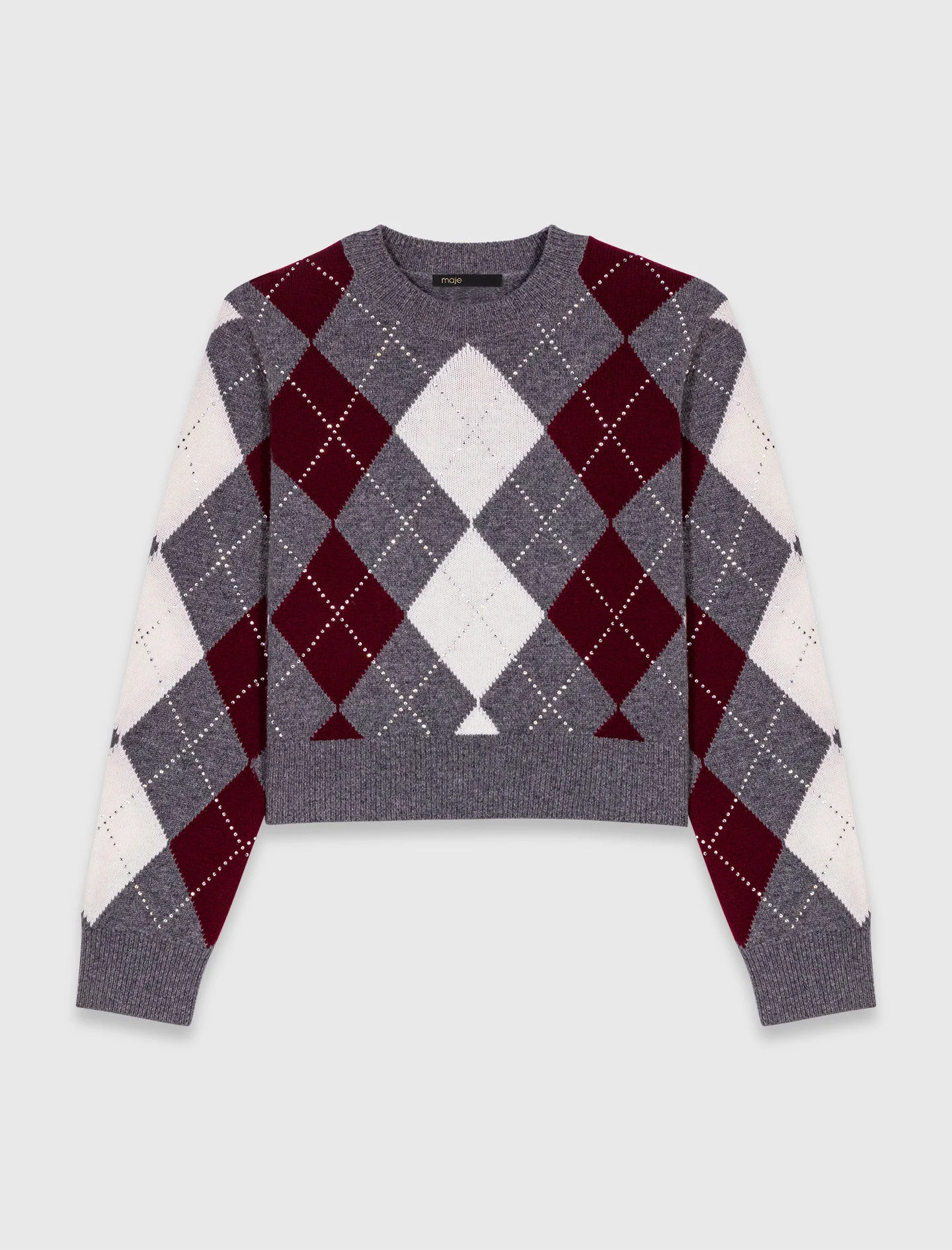 Cropped argyle pattern sweater Maje is reinventing the preppy look with must-have pieces to make your own and accessorise all season long. This soft knit jumper features a diamond pattern subtly embellished with rhinestones. With a round neck and long sleeves, it's a versatile piece: wear it for a chic look with tailored trousers, or more casually with jeans. - Soft knit sweater - Diamond pattern with rhinestones - Round neck and long sleeves - Ribbed trim - Designed for a boxy fit The model is 5' 10 and wears a size 1. Reference: MFPPU00945_Q009 Composition & care Main material: 100% wool Rib: 94% wool, 5% polyamide, 1% elastane Hand wash Do not bleach Do not tumble dry Iron at a maximum temperature of 110°C without steam Do not dry clean