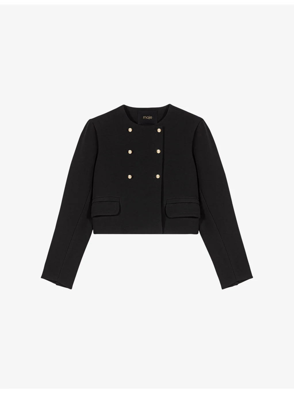PRODUCT DETAILS - Maje woven jacket - 62% viscose, 15% polyester, 12% acrylic, 10% wool, 1% polyamide - Exposed button fastening at front - Regular fit, round neck, button-down design, long sleeves, cropped - Dry clean - True to size - Model is 5ft 9in/1.75m and wears a size UK 8 - Midweight, non-stretch Ref: R04532878
