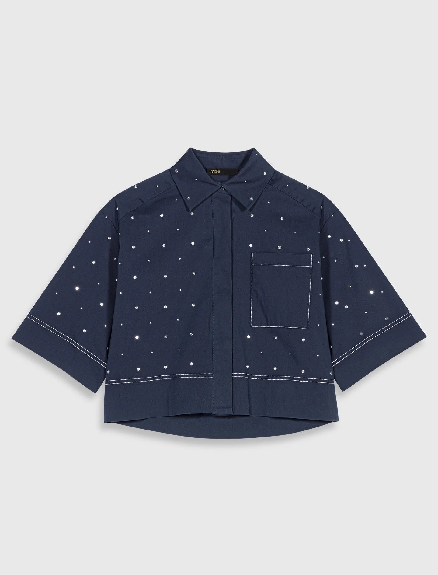 Cropped shirt with studs Maje modernises the wardrobe with a modern twist, offering a stylish transition between seasons. This studded canvas shirt features a cropped cut, both chic and casual, with contrasting topstitching. Longer at the back, it has a patch pocket on the chest and a button fastening with covered placket. An ideal choice to pair with the matching skirt, a top and square-toed ballet flats. - Cropped studded canvas shirt with contrasting topstitching - Longer at the back - Patch pocket on the chest - Button fastening with covered placket - Designed for a cropped, boxy fit The model is 5' 10 and wears a size 1. Reference: MFPCM00679_0103 Composition & care Main material: 69% cotton, 28% polyamide, 3% elastane Hand wash Do not bleach Do not tumble dry Iron at a maximum temperature of 110°C without steam F/ - Professional dry clean, with hydrocarbon solvent, gentle treatment
