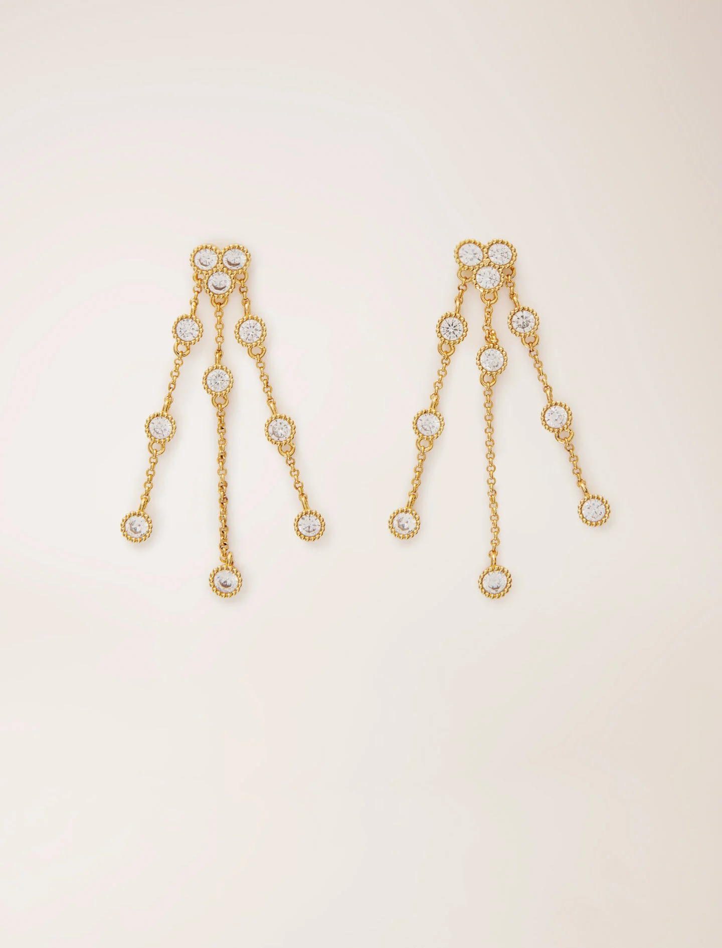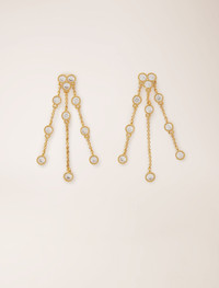 Gold-plated recycled brass earrings This season, Maje is creating delicate, timeless jewellery combining sophistication and femininity. Inspired by the golden opulence of the '80s, these gorgeous, elegant accessories are perfect for any occasion and will set off any outfit. Accentuate your look in any situation with these golden recycled brass dangle earrings that will instantly add a touch of sparkle to your outfits. Elegant and subtle, they are embellished with a succession of fine chains and silver rhinestones. - Pendant earrings - Silver rhinestones - Gold-plated recycled brass Reference: MFABI00850 Composition & care Stones: 100% zirconium oxide Jewellery: 100% brass Do not wash Do not bleach Do not tumble dry Do not iron Do not dry clean