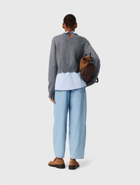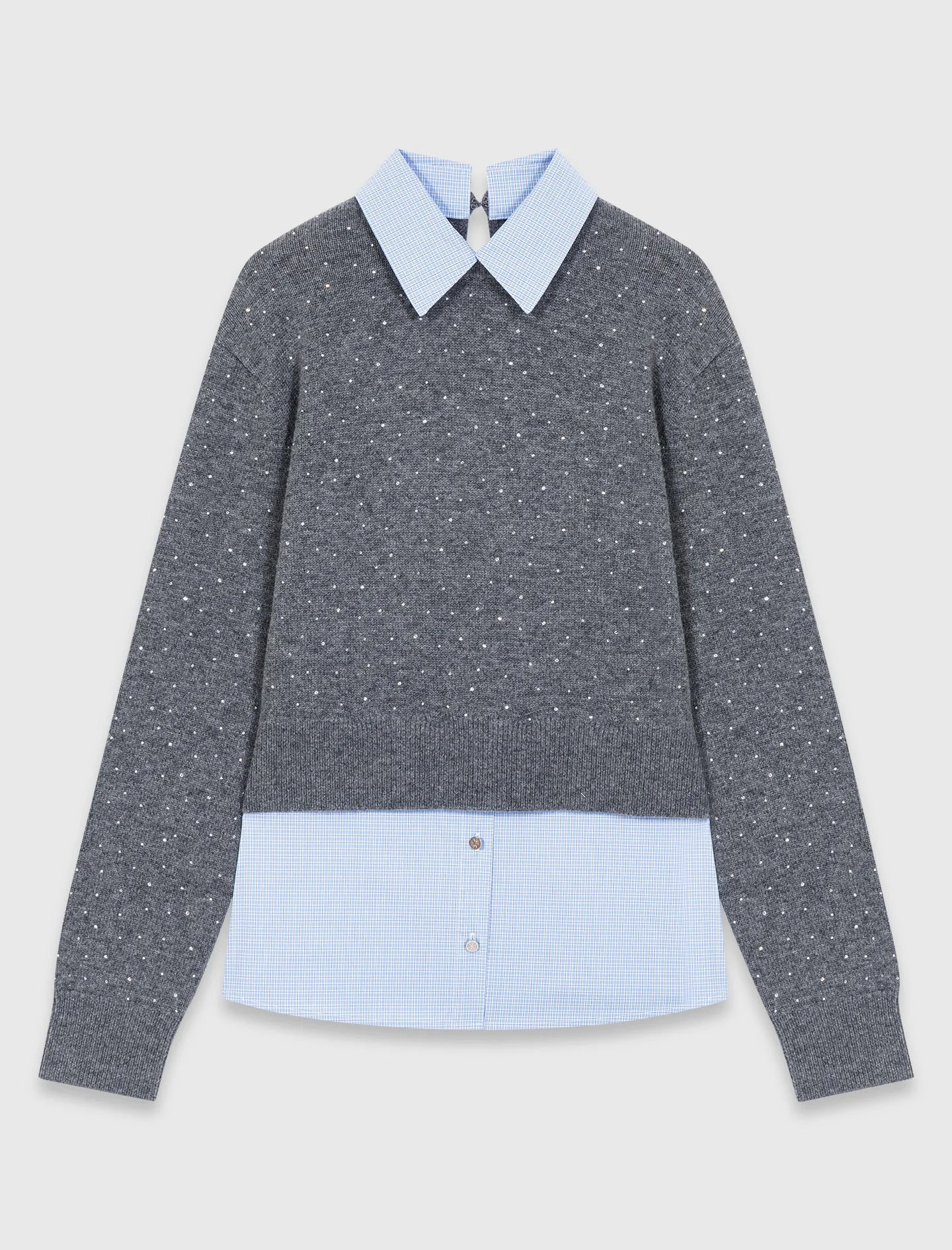 Removable rhinestone trim jumper Inspired by bold femininity, this piece fuses radiance and modernity for a look that combines sophistication and freedom. The mottled grey wool blend jumper, scattered with bright rhinestones, reveals a structured silhouette, enhanced by the layered effect of a removable sky-blue checked poplin shirt. The cropped cut and precious knit highlight a contemporary spirit, while the ribbed trim and interplay of shine offer a graphic elegance. For an assertive yet casual look, pair it with jeans, an M tote bag in a smooth leather and suede blend, and matching loafers. - Cropped rhinestone-embellished wool blend jumper with removable details - All-over silver rhinestones - Removable checked poplin shirt details - Layered 3-in-1 effect - Wide rib knit trim The model is 5' 9 and wears a size FR 1. Reference: MFPPU00985_0505 Composition & care Main material: 94% wool, 5% polyamide, 1% elastane Secondary material: 76% cotton, 21% polyamide, 3% elastane Rib: 94% wool, 5% polyamide, 1% elastane Hand wash Do not bleach Do not tumble dry Iron at a maximum temperature of 110°C without steam Do not dry clean