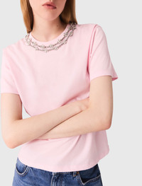 Short-sleeve jewel neck T-shirt For this new season, Maje offers a collection of modern and elegant pieces. A light transition between summer and autumn. This round neck, short-sleeved T-shirt is distinguished by its rhinestone jewellery at the neck, adding a chic and sparkling detail to this timeless piece. With its chic and casual cut, it's the perfect T-shirt for everyday wear. Wear it with denim shorts and signature accessories like a cargo bag and chunky-soled loafers for a trendy, relaxed look. Ref: MFPTS00974 - Round neck and short-sleeved T-shirt - Rhinestone jewellery at the neck - Button fastening at the back - Designed for a boxy fit The model is 5' 10 and wears a size 1. Reference: MFPTS00974_0183 Composition & care Main material: 100% cotton Rib: 95% cotton, 5% elastane Regular cycle 30° Do not bleach Do not tumble dry Iron at a maximum temperature of 110°C without steam Do not dry clean