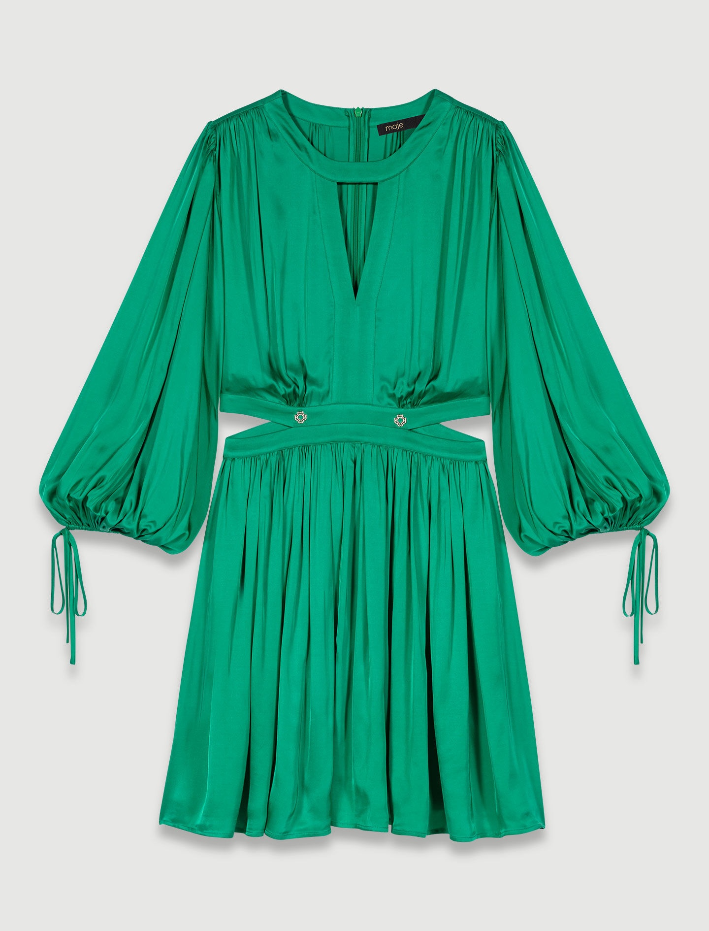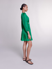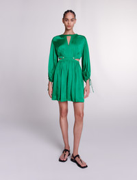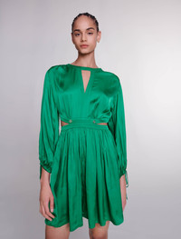 Short satin-look dress The Maje studio celebrates a wardrobe of timeless pieces with bold cuts and feminine details to uplift your day and evening wear. This short, satin-effect shift dress in this season's signature colour creates an alluring light, airy silhouette. Alongside a zip fastening at the back and long-sleeved cuffs gathered with ties, it boasts a ruched-effect top and a full, pleated skirt. Embellished with small Clover studs on the neck and waist, with cutaway sides and a round neckline with an open V yoke to subtly reveal a glimpse of the skin. - Short satin shift dress - Cutaway sides - Pleated skirt The model is 5' 9 and wears a size 36. Reference: MFPRO03626_09 Composition & care Main fabric: 100% viscose Hand wash Do not bleach Do not tumble dry Iron at a maximum temperature of 110°C without steam F/ - Professional dry clean, with hydrocarbon solvent, gentle treatment