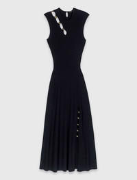 Cutaway rib knit maxi dress When the return to city life becomes a creative playground, the knit dress stands out as a bold, graphic and resolutely modern statement piece. This sleeveless midi dress, with its interplay of asymmetrical cut-outs accentuated by gold-tone metal hardware, elegantly hugs the figure while subtly revealing glimpses of skin. Pair it with a suede Miss M bag and gold heeled sandals for a bold and contemporary evening look. - Black rib knit - Asymmetrical cut-outs adorned with gold-tone metal hardware - Midi length - High thigh slit The model is 5' 10 and wears a size FR 36. Reference: MFPRO04535_2517 Composition & care Main material: 56% viscose, 42% polyamide, 2% elastane Hand wash Do not bleach Do not tumble dry Iron at a maximum temperature of 110°C without steam Do not dry clean