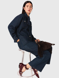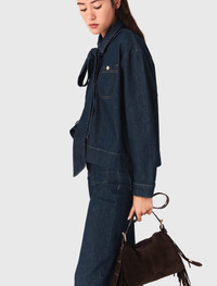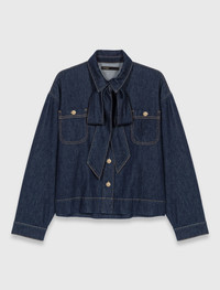 Denim jacket with bow Denim tailoring is making its mark in the wardrobe. A play on proportions and a controlled look for this oversized shirt with a tied collar. This loose shirt revisits the utility wardrobe with a couture touch. The tie-up lavalliere collar accentuates the look, while the press-stud flap pockets enhance the graphic aspect of the piece. Wear it as a complete look or to modernise a tailored silhouette with a relaxed vibe. - Short loose raw denim shirt - Tie-up lavalliere collar - Patch pockets with press-stud flaps - Designed for a boxy fit The model is 5' 10 and wears a size 1. Reference: MFPCM00700_0103 Composition & care Main material: 100% cotton Pussycat bow: 100% cotton Regular cycle 30° Do not bleach Do not tumble dry Iron at a maximum temperature of 110°C without steam F - Professional dry clean, with hydrocarbon solvent, normal treatment