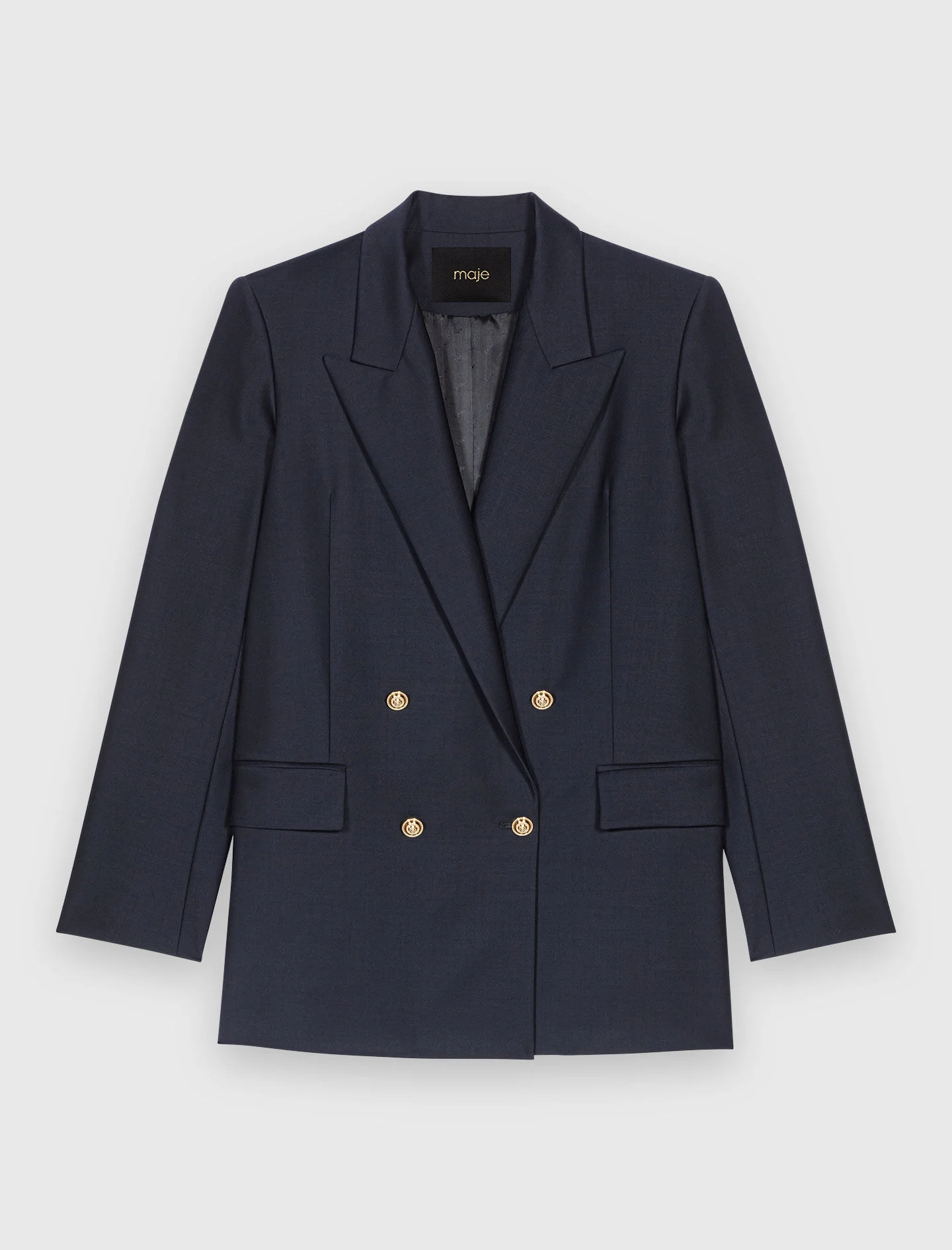 Suit jacket with gold buttons Imagined as a reimagined tailoring, the collection puts a twist on classic suits with striking details. This structured jacket adds a lot of style to the silhouette and features a double-breasted design with officer buttons, inspired by the naval wardrobe. Wear it as a complete look with matching shorts, a colourful knit polo, and leather ankle boots. - Suit jacket with officer buttons - Structured cut with shoulder pads - Double-breasted fastening - Designed for a boxy fit The model is 5' 10 and wears a size 36. Reference: MFPVE00689_0103 Composition & care Main material: 52% polyester, 43% wool, 5% elastane Lining: 100% viscose Do not wash Do not bleach Do not tumble dry Iron at a maximum temperature of 110°C without steam F - Professional dry clean, with hydrocarbon solvent, normal treatment