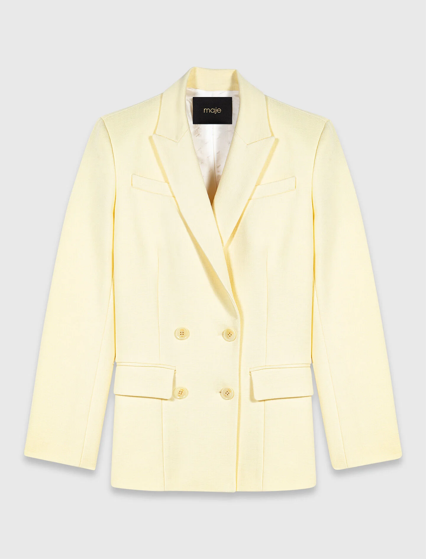 Double-breasted suit jacket The chic, sunny spirit of the French Riviera inspires an assertive look, where pastel light meets the rigour of tailoring. This double-breasted blazer features a fitted cut, subtly textured fabric and meticulous finishes, while the logo lining adds a signature touch on the inside. The flap pockets and tone-on-tone buttons structure the silhouette for timeless elegance. - Pastel yellow double-breasted blazer - Fitted and structured cut - Round tone-on-tone buttons - Flap pockets and a welt chest pocket - Maje jacquard logo lining The model is 5' 9 and wears a size FR 36. Reference: MFPVE00785_0259 Composition & care Main material: 80% viscose, 19% polyester, 1% elastane Lining: 100% viscose Do not wash Do not bleach Do not tumble dry Iron at a maximum temperature of 110°C without steam F/ - Professional dry clean, with hydrocarbon solvent, gentle treatment