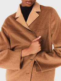 Double-faced mid-length coat Between Paris and New York, the wardrobe blends modernity with timeless elegance. The silhouettes play with textures and contrasts for a look that is both metropolitan and refined.This double-faced coat stands out for its versatility and bold style. The contrasting collar highlights a subtle interplay of textures and colours, and the short, structured cut fits the silhouette perfectly. Designed to keep up with the bustling pace of city life, this coat adapts to all desires and occasions. Wear it with a knitted top, a leopard skirt, a jumper tied at the waist, and high leather boots. - Short double-faced coat - Contrasting collar - Button fastening The model is 5' 10 and wears a size 36. Reference: MFPOU01346_0067 Composition & care Main material: 70% wool, 30% polyamide Pocket lining: 100% polyester Do not wash Do not bleach Do not tumble dry Iron at a maximum temperature of 110°C without steam F/ - Professional dry clean, with hydrocarbon solvent, gentle treatment