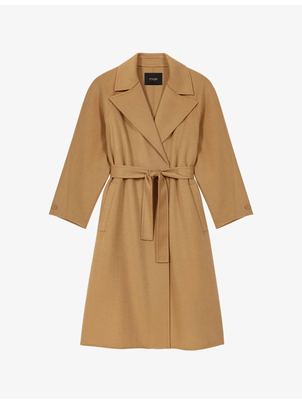PRODUCT DETAILS - Maje wool-blend coat - 80% wool, 20% polyamide - Relaxed fit, wide lapels, self-tie belt at waist, buttoned tab at cuffs, two side pockets, vent at back hem, double faced - Dry clean only - True to size - Model is 5ft 9in/1.75m and wears a size UK 8 - Heavyweight, non-stretch Ref: R04541377