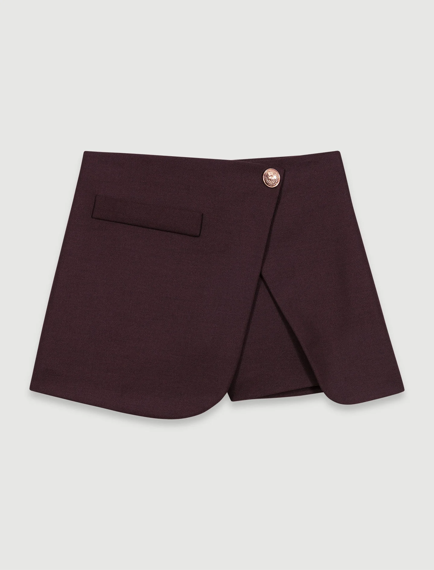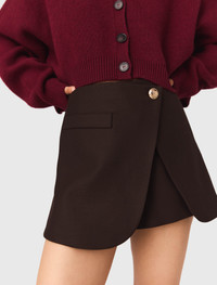 Skort The studio unveils its new collection, the epitome of Parisian chic. Elegance and sophistication unite in a subtle interplay of contrasts and proportions, giving your looks a confident, modern edge. This skort features an open-effect panel, embellished with a gold button at the waist for a daring look. With an elasticated, zipped back, it has a large pocket for an elegantly structured silhouette. A real statement piece, it can be combined with a knitted jumper, a shoulder bag and ankle boots. - Panelled skort - Gold button - Open-effect panel at the front - Large side pocket - Elasticated back - Zip fastening at back The model is 5' 10 and wears a size 36. Reference: MFPSH00601_G005 Composition & care Main fabric: 52% polyester, 26% wool, 18% viscose, 4% elastane Underside fabric: 100% polyester Gentle cycle 30° Do not bleach Do not tumble dry Iron at a maximum temperature of 110°C without steam F - Professional dry clean, with hydrocarbon solvent, normal treatment