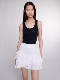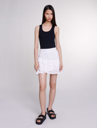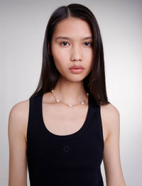 Rib knit tank top Inspired by a distinctly British wardrobe, the studio boldly and stylishly reinterprets women's wardrobe essentials. This season's star piece, the classic ribbed knit tank top, has been updated with sexy details to give your everyday silhouettes a new spin. Featuring wide straps and a round neckline, it also has a tone-on-tone Clover patch. Inspired by the elegance of the '90s, it can be worn on its own or layered with shirts for mid-season. Ideal for casual or office wear, mix and match it with suit trousers accentuated with a belt. When it comes to accessories, opt for a cap, bag and ballet flats embellished with studs. - Rib knit tank top - Clover Patch - Wide shoulder straps Reference: MFPTS00872_2517 Composition & care Main material: 98% cotton, 2% elastane Embroidery: 100% polyester Gentle cycle 30° Do not bleach Do not tumble dry Iron at a maximum temperature of 110°C without steam Do not dry clean