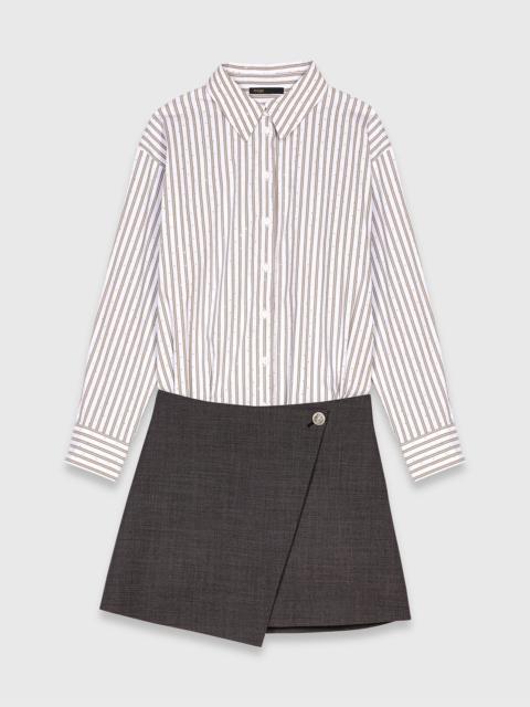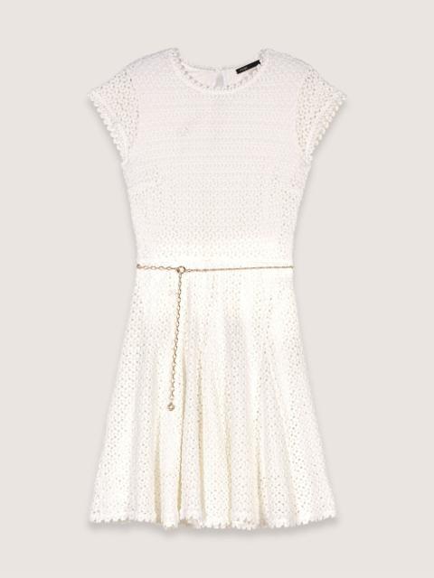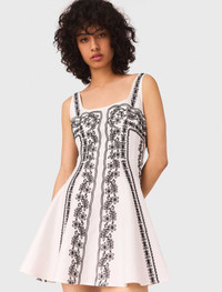 Mini embroidered strap dress This short linen dress showcases floral embroidery with delicate contrasts, with panels hand-assembled. Its square neckline with straps frames the silhouette, while the flared skirt offers plenty of lightness. A summer piece to include in your wardrobe. - Short linen dress with contrasting floral embroidery - Square neckline with straps - Flared skirt - Back zip fastening - Hand-assembled embroidered panels - Designed for a tailored fit The model is 5' 9 and wears a size 36. Reference: MFPRO04250_1002 Composition & care Main material: 55% linen, 45% viscose Embroidery: 100% cotton Bias binding: 100% cotton Hand wash Do not bleach Do not tumble dry Iron at a maximum temperature of 110°C without steam F/ - Professional dry clean, with hydrocarbon solvent, gentle treatment
