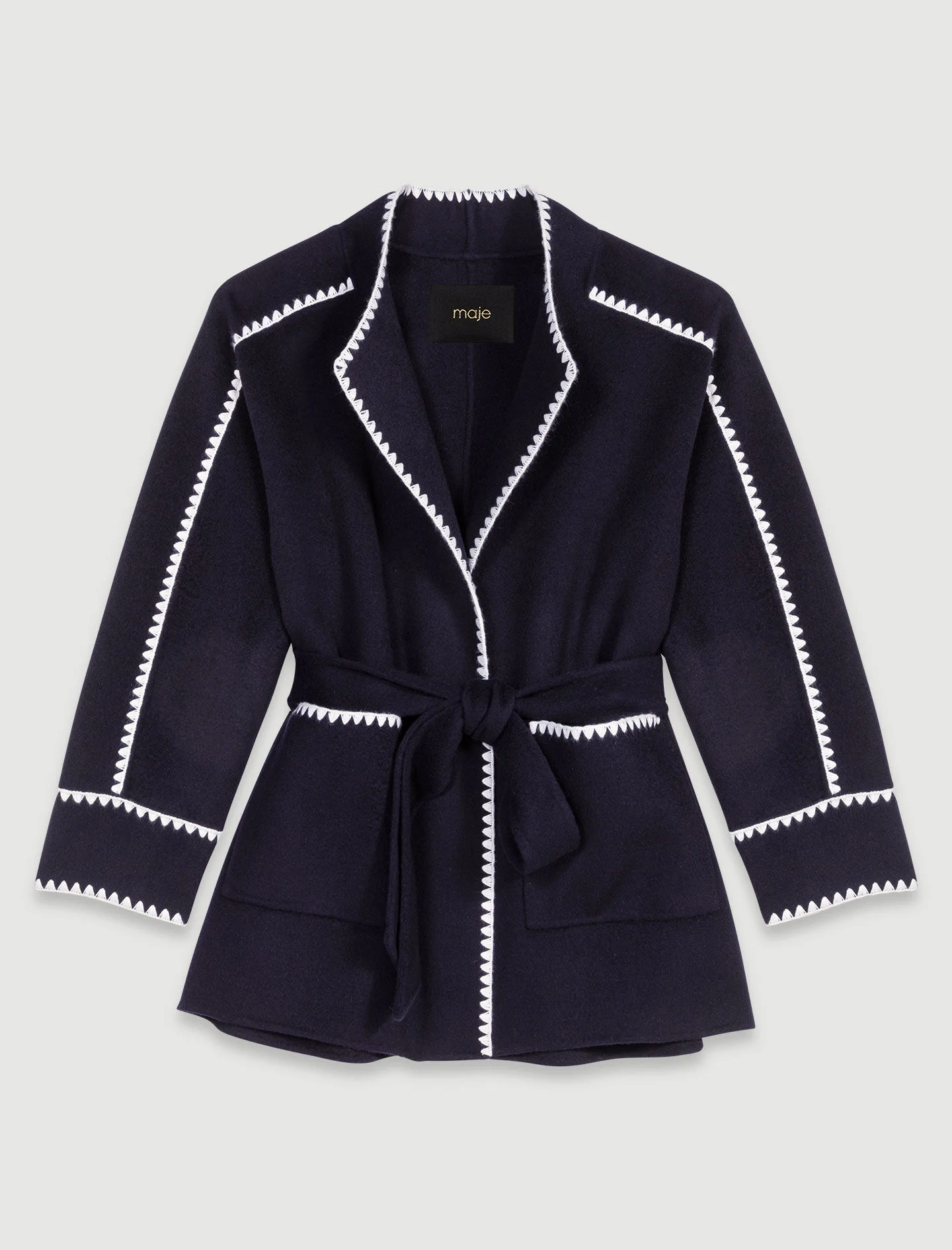 Double-faced coat This winter, the studio has created an ode to timeless Parisian elegance. From preppy everyday wear to glittering evening events, the new collection is all about sophistication and boldness, in a subtle interplay of colours and cuts. This cropped coat has structured lines and contrasting edges for a sophisticated silhouette. With long sleeves and two patch pockets, you can wear it tied at the waist for a bold wrap look, or undone for a more casual look. Easy to mix and match, pair it with a knitted jumper and skirt, and complete your outfit with jewellery and socks slipped into loafers. - Belted short coat - Wrap neck - Contrast edging - Belt at the waist - 2 patch pockets The model is 5' 10 and wears a size 36. Reference: MFPOU01259_O013 Composition & care Main fabric: 78% wool, 22% polyamide Embroidery: 100% acrylic Do not wash Do not bleach Do not tumble dry Iron at a maximum temperature of 110°C without steam F/ - Professional dry clean, with hydrocarbon solvent, gentle treatment