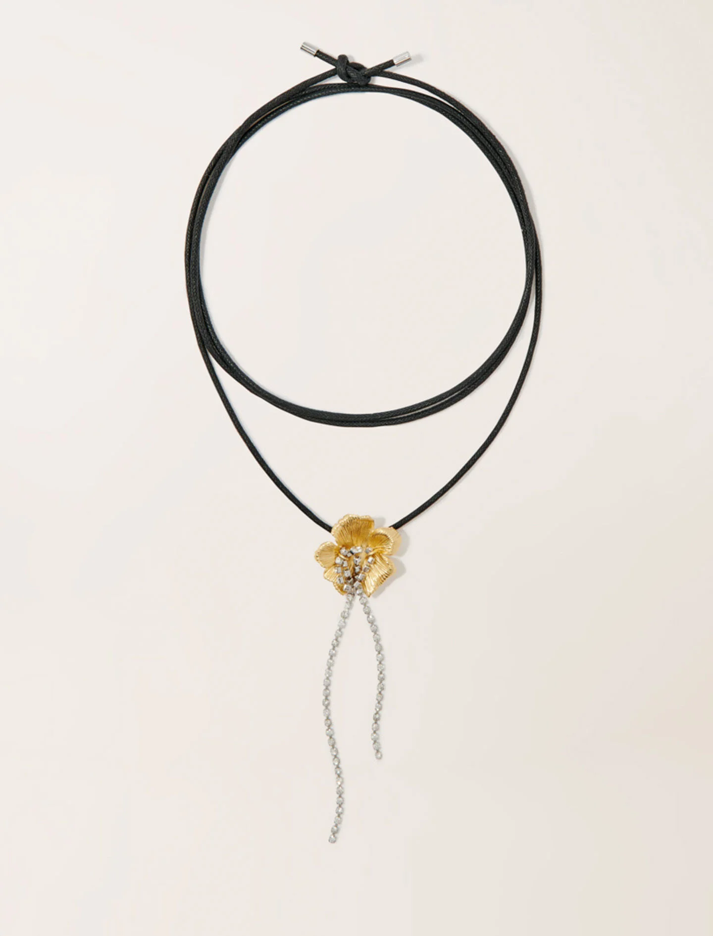 Flower necklace For the new collection, the Maje studio is inspired by the elegance of the 90s to create bold accessories. Both chic and casual, this choker necklace reveals a golden flower adorned with silver rhinestones. Featuring a cotton cord, it ties twice and easily adjusts to your neck. To be worn without moderation, it punctuates your evening or more casual outfits with style. Ref: MFABI00859 - Choker - Cotton cord - Flower and rhinestones Reference: MFABI00859 Composition & care Diamante: 100% glass Jewellery: 100% brass Cord: 100% cotton Do not wash Do not bleach Do not tumble dry Do not iron Do not dry clean