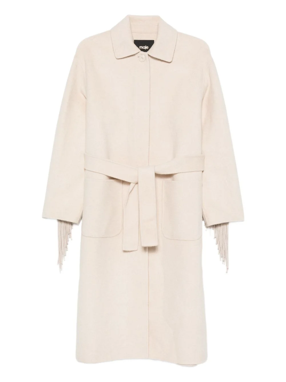fringe-trimmed belted single-breasted coat Highlights - Beige - Self-tie belt - Patch pockets - Long sleeves - Fringe detailing Imported Composition Fabric 100% SIZE & FIT Model measurements Height 5 ft 9 in(1.75 m) Bust/Chest 34.64 in(88 cm) Hips 36.61 in(93 cm) Waist 26.37 in(67 cm) Washing instructions Dry Clean Only