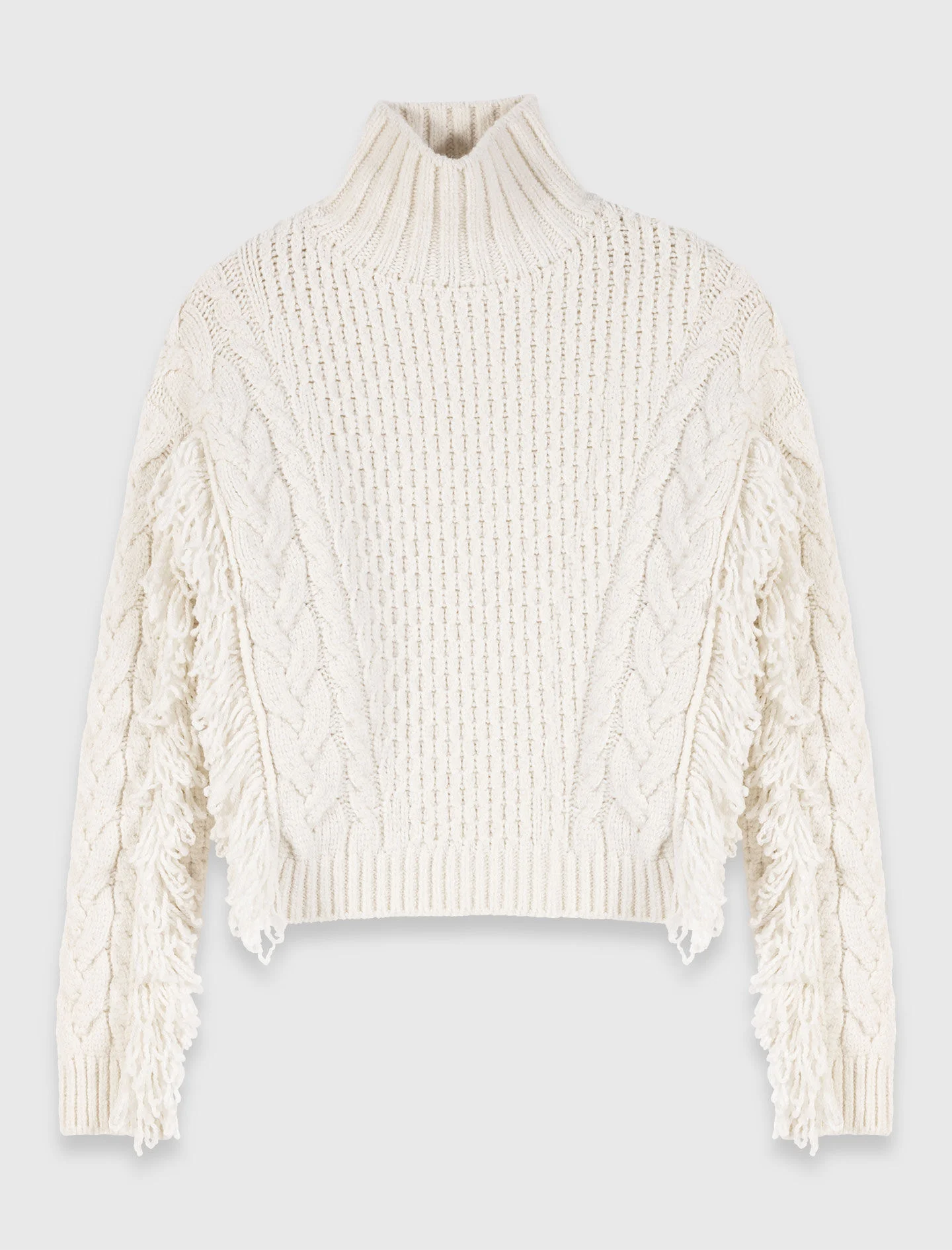 Wool-blend sweater This season highlights chunky knits, designed to bring warmth and character to your silhouette. A variety of textures transforms these pieces into wardrobe essentials. This long-sleeved jumper stands out with its cable knit combined with fringes along the sleeves, which add texture and movement. The ribbed high neck accentuates the look, while the fit remains modern and easy to wear. Wear it with a short suede skirt, biker boots and a Miss M bag for a modern, textured look. - Cable-knit jumper - Ribbed high neck - Fringe details - Designed for a loose fit The model is 5' 10 and wears a size 1. Reference: MFPPU00968_0101 Composition & care Main material: 49% wool, 48% acrylic, 3% elastane Rib: 49% wool, 48% acrylic, 3% elastane Hand wash Do not bleach Do not tumble dry Iron at a maximum temperature of 110°C without steam F - Professional dry clean, with hydrocarbon solvent, normal treatment