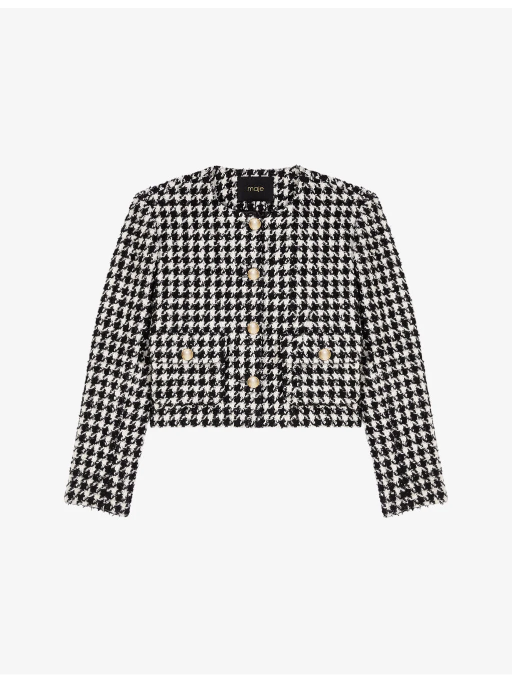 PRODUCT DETAILS - Maje tweed jacket - 33% cotton, 25% acrylic, 24% polyester, 14% wool, 2% metalized fibers, 2% other fibres - Exposed button fastening at front - Regular fit, round neck, long sleeves, two pockets at the side, all-over houndstooth design, gold-tone hardware - Dry clean - True to size - Model is 5ft 10in/1.78m and wears a size UK 8 - Midweight, non-stretch Ref: R04532900
