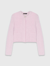 Jewelled bow cardigan This collection marks a bold return to the city, where comfort blends with style, and every detail counts. This short, sky-blue knit cardigan, made partly from alpaca, has a straight cut and a fluffy texture. A sparkling jewel bow at the neckline and two refined patch pockets define this characterful piece. For an urban silhouette, wear it over a white shirt with lace details and grey flare jeans, and add a Miss M mini for a touch of character. - Short knit cardigan with alpaca - Rhinestone bow jewel button at the collar - Short and straight cut - 2 front patch pockets - Ribbed edging The model is 5' 10 and wears a size FR 1. Reference: MFPCA00671_0183 Composition & care Main material: 52% polyamide, 48% alpaca Pocket: 53% polyamide, 46% alpaca, 1% elastane Hand wash Do not bleach Do not tumble dry Iron at a maximum temperature of 110°C without steam Do not dry clean