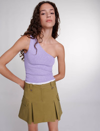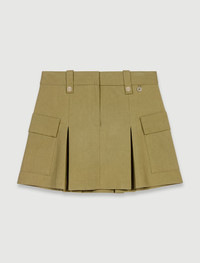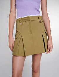 Pleated mini skirt Summer is just around the corner, and with it comes an irresistible urge to travel! From days on the beach to special occasions and chic evenings, the studio has created the perfect suitcase, so you can celebrate your summer in style. Made from cotton, this 2000s-inspired short skirt with box pleats stylishly structures your silhouette. The fitted waist is accentuated with a contrasting stripe and belt loops embellished with intricate detailing. With a zip and hook-and-eye fastening, it features two flap pockets and a pleated trim. Pair it with an asymmetric top, bucket bag and platform sandals for a chic casual outfit. - Short pleated skirt - Belt loops with buttons - 2 flap pockets Reference: MFPJU01256_0020 Composition & care Main fabric: 51% cotton, 45% viscose, 4% elastane Belt lining: 100% cotton Normal cycle 30° Do not bleach Do not tumble dry Iron at a maximum temperature of 150°C F - Professional dry clean, with hydrocarbon solvent, normal treatment