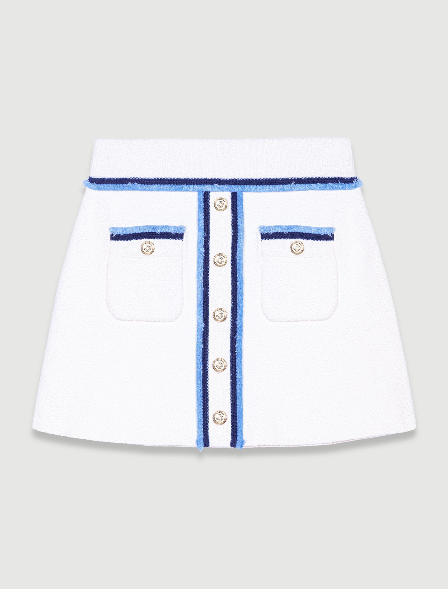 Terry knit skirt Bold styles, an interplay of textures and feminine details: the studio has come up with versatile, daring pieces that are ideal for making your outfits stand out, day or night. This short skirt in terry knit has a neat cut and strong lines. It has a ribbed, elasticated waistband, two patch pockets and a mock fastening embellished with buttons. Supremely chic, it is underlined by contrasting piping and fringed trim in vibrant colours. - Short skirt in terry knit - Fringed trim - 2 patch pockets with buttons The model is 5' 9 and wears a size 36. Reference: MFPJU01185_0101 Composition & care Main material: 55% cotton, 43% polyamide, 2% elastane Tab: 57% cotton, 42% polyamide, 1% elastane Pocket: 57% cotton, 42% polyamide, 1% elastane Braid: 55% cotton, 21% modal, 17% polyester, 7% linen Waistband: 57% cotton, 42% polyamide, 1% elastane Hand wash Do not bleach Do not tumble dry Iron at a maximum temperature of 110°C without steam F/ - Professional dry clean, with hydrocarbon solvent, gentle treatment