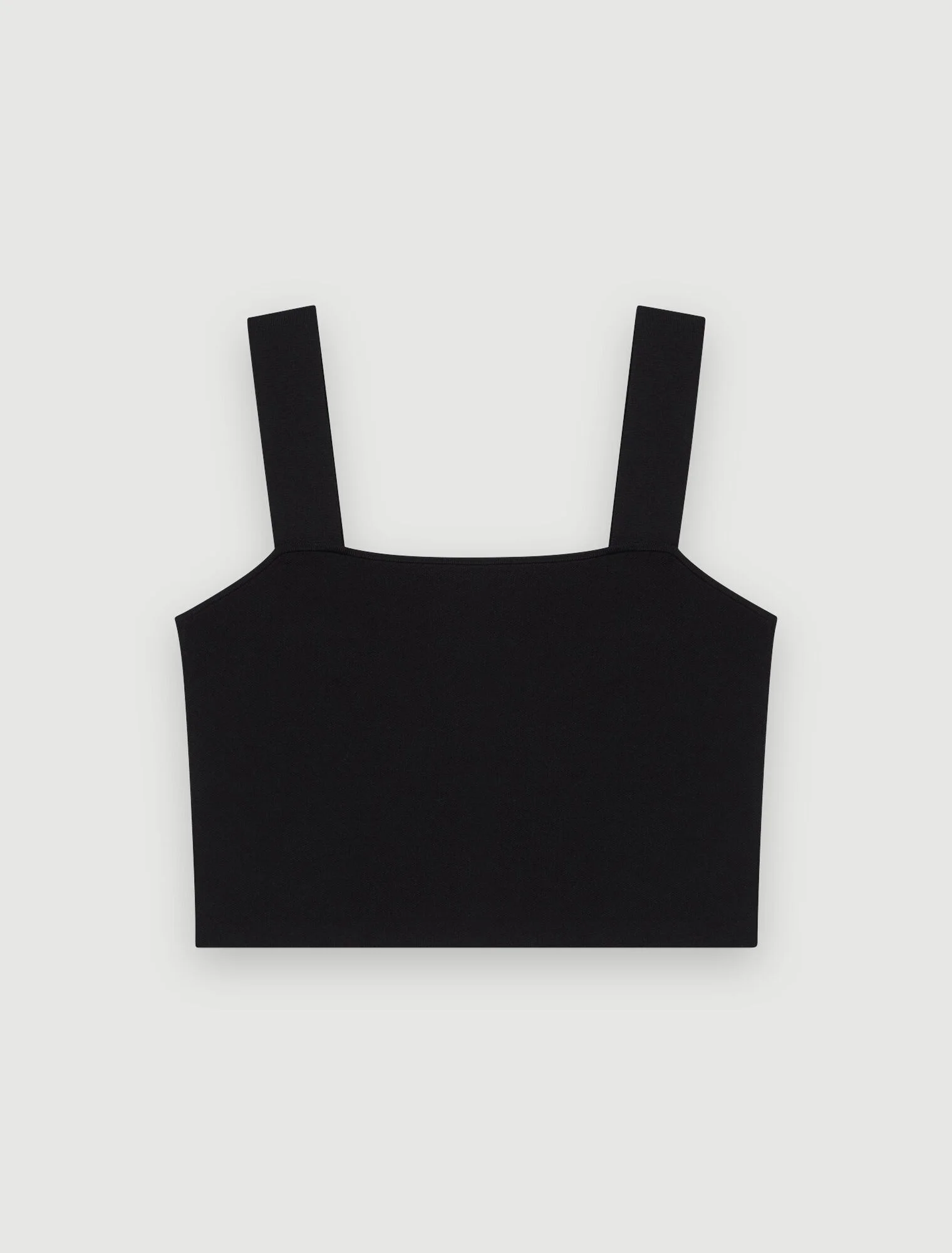 Knitted crop top with straps Close-fitting, short black knitted top. Plain-coloured stretch knit fabric. Wide straps. Slightly square neckline. Can be worn with the JACLYNA knitted skirt to complete the look. - Short knitted top - Black stretch knit fabric - Slightly square neckline Reference: MFPTO01414_2517 Composition & care Main material: 68% viscose, 30% polyamide, 2% elastane Strap: 81% viscose, 19% polyamide Hand wash Do not bleach Do not tumble dry Iron at a maximum temperature of 110°C without steam F - Professional dry clean, with hydrocarbon solvent, normal treatment