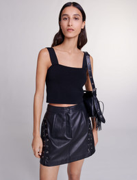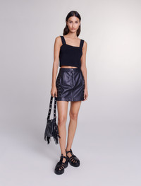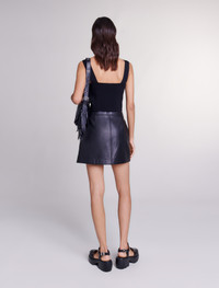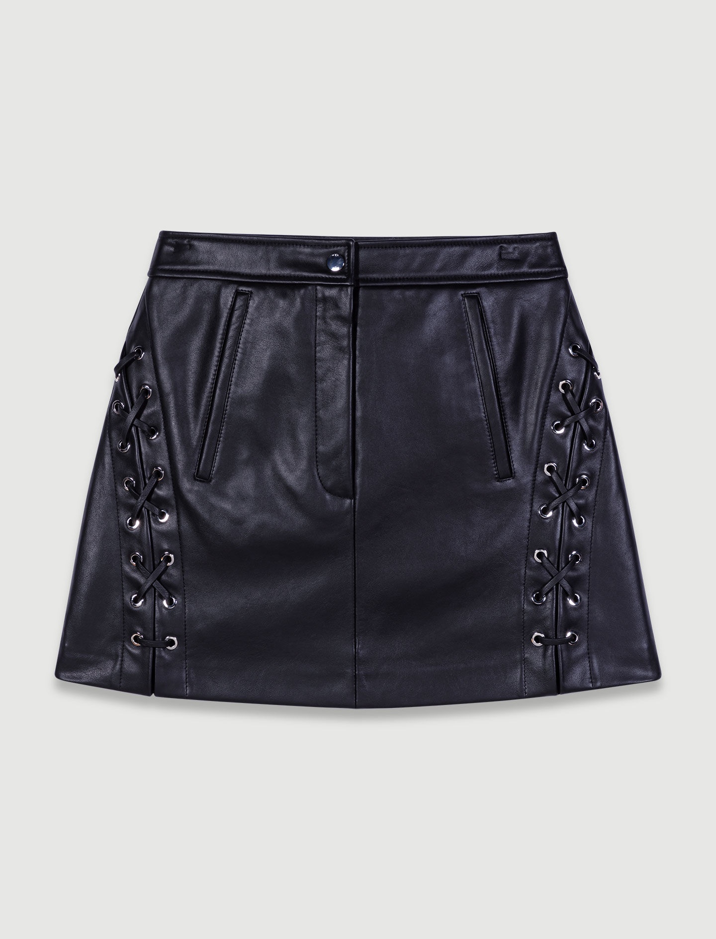 Short leather skirt Bold styles, an interplay of textures and feminine details: the studio has come up with versatile, daring pieces that are ideal for making your outfits stand out, day or night. Crafted from leather, this short skirt features sexy details for a simply captivating look. Featuring a press stud zip fastening and two pockets, a sophisticated interplay of lacing on the sides gives your silhouette a bold touch. - Short leather skirt - Lace-up details - 2 front pockets The model is 5' 9 and wears a size 36. Reference: MFPJU01172_2517 Composition & care Lining: 100% polyester Yoke: 100% goat Lace: 100% lamb Leather: 100% lamb Pocket lining: 100% polyester Do not wash Do not bleach Do not tumble dry Do not iron Do not dry clean