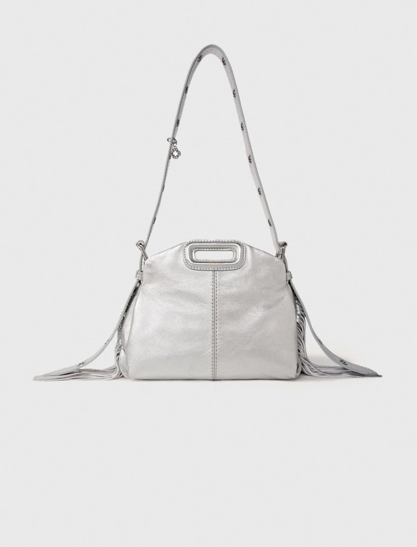 Metallic leather Miss M Mini bag The latest addition to Maje's collection, Miss M is a real fashion statement. Judith Milgrom has designed a generation's It bag with the hallmarks of the classic M — rectangular leather handles, fringing and detailed topstitching. It has the cool Maje look and is designed to be a versatile accessory, coming in two sizes and a variety of fabrics and colours. Thanks to the long adjustable eyelet strap, create a variety of styles! Carry it by hand for a casual look; short or longer on your shoulder for a classic touch. Or wear it cross-body for a stylish urban vibe. The Miss M stands out for its generous bold buckles at each end of the handles and subtle piercing allowing for endless charm personalisation. This mini metallic leather version is compact with room for your essentials and will make you sparkle day and night. - Mini metallic leather bag with eyelet strap - 4 carrying options - Dimensions: 22 x 13 x 11 cm and strap: 115 cm - 1 interior patch pocket - Flap fastening Reference: MFASA01079 Composition & care Lining: 100% polyester Leather: cow leather Do not wash Do not bleach Do not tumble dry Do not iron Do not dry clean