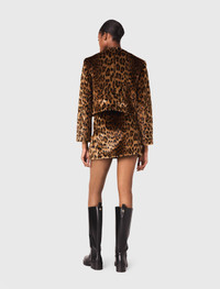 Leopard faux fur jacket Between Paris and New York, the wardrobe is reinvented with boldness and elegance, blending iconic prints and structured cuts. Silhouettes are defined with controlled volumes and sophisticated details, giving rise to pieces that are both modern and timeless. This short faux leopard fur jacket stands out with its shoulder pads that sculpt the silhouette. The button fastening and flap pockets add a classic and functional touch, while the leopard print injects dynamic and contemporary energy. A strong piece, perfect for enhancing a metropolitan look with confidence and style. Wear it with the matching skirt, a turtleneck jumper and riding boots for a chic and bold look. - Short faux leopard fur jacket - Shoulder pads - Button fastening and side flap pockets - Designed for a standard fit The model is 5' 10 and wears a size 36. Reference: MFPOU01424_K039 Composition & care Lining: 100% viscose Faux fur: 100% modacrylic Mesh: 100% polyester Do not wash Do not bleach Do not tumble dry Iron at a maximum temperature of 110°C without steam F/ - Professional dry clean, with hydrocarbon solvent, gentle treatment