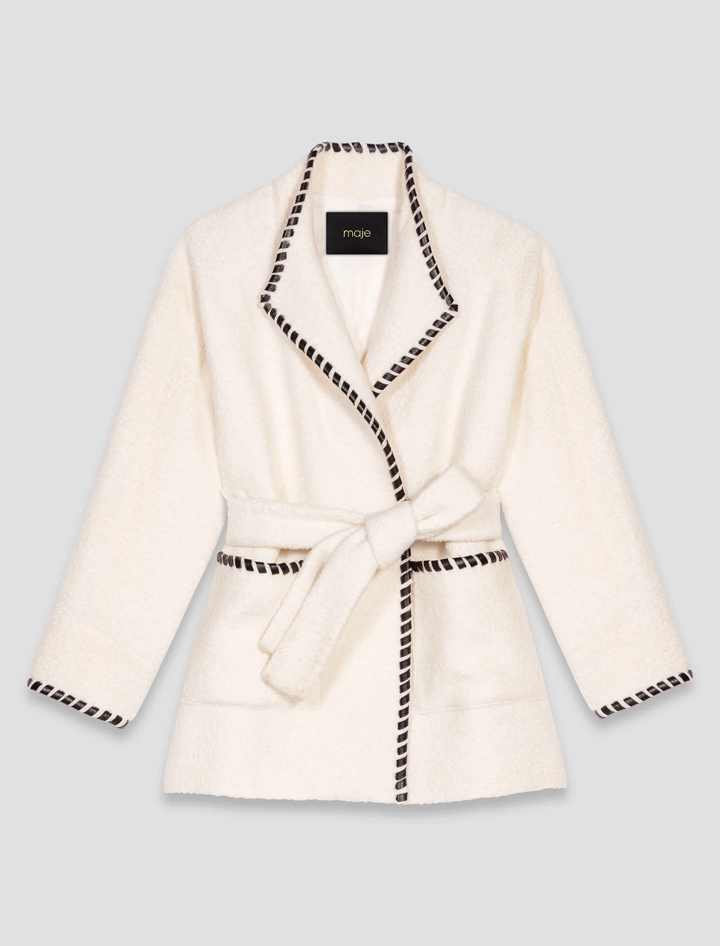 Lined coat with contrasting ribbon This season, Maje is reinventing the essentials to wrap silhouettes in softness and modernity. A structured, graphic piece that plays on sharp contrasts to bring a modern warmth to your look. Belted, this soft-touch coat creates a structured look, ideal for the season. Wear with wide-leg black trousers and patent loafers, and accessorise with a black fringed bag. - Mid-length double-faced wool coat - Contrasting braided leather-look trim on the edges - Removable belt - Designed for a loose fit The model is 5' 10 and wears a size 36. Reference: MFPOU01375_1002 Composition & care Main material: 72% wool, 16% polyamide, 12% alpaca Lining: 100% polyester Faux leather: 100% polyurethane Do not wash Do not bleach Do not tumble dry Do not iron F/ - Professional dry clean, with hydrocarbon solvent, gentle treatment