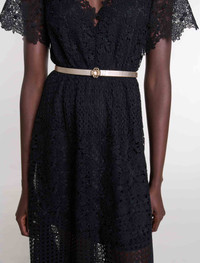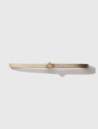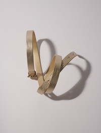 Slim belt with Clover buckle This season, the studio pays tribute to the celebratory spirit and timeless elegance of French fashion. An ode to glamour and sophistication, each piece embodies a party vibe and a sense of celebration, redefining chic with a touch of daring. Add a golden Clover buckle to your outfit with this metal belt. Slim and adjustable, slip it into the belt loops of jeans or over a floaty dress to emphasise the waist in style. - Gold-tone metal belt - Adjustable - Clover buckle - Dimensions: cm Reference: MFACE00378_J003 Composition & care Lining: 91% polyester, 9% viscose Coating: 100% polyurethane Buckle: 100% zamac Leather: cow Do not wash Do not bleach Do not tumble dry Do not iron Do not dry clean