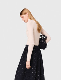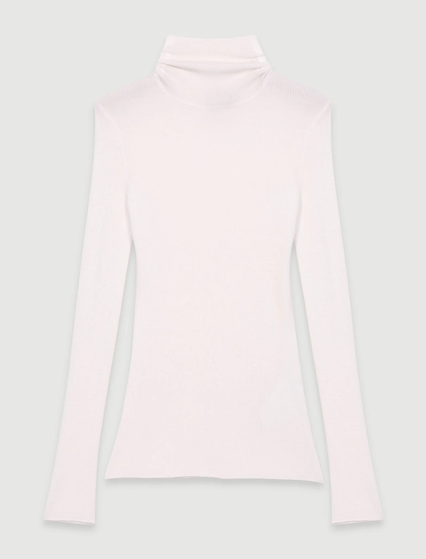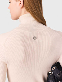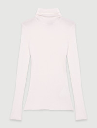 Wool and silk jumper The studio unveils its new collection, the epitome of Parisian chic. Elegance and sophistication unite in a subtle interplay of contrasts and proportions, giving your looks a confident, modern edge. This fitted rib-knit jumper has a second-skin effect. Alongside a turtleneck and long sleeves, it has an embroidered Clover tag on the back for an understated touch of sophistication. Wear it on its own or layer it with jeans, a bag and sandals. - Fitted rib knit jumper - Snug fit - Turtleneck - Embroidered Clover tag on back The model is 5' 10 and wears a size 36. Reference: MFPPU00875_0101 Composition & care Main material: 74% wool, 26% silk Hand wash Do not bleach Do not tumble dry Iron at a maximum temperature of 110°C without steam F - Professional dry clean, with hydrocarbon solvent, normal treatment