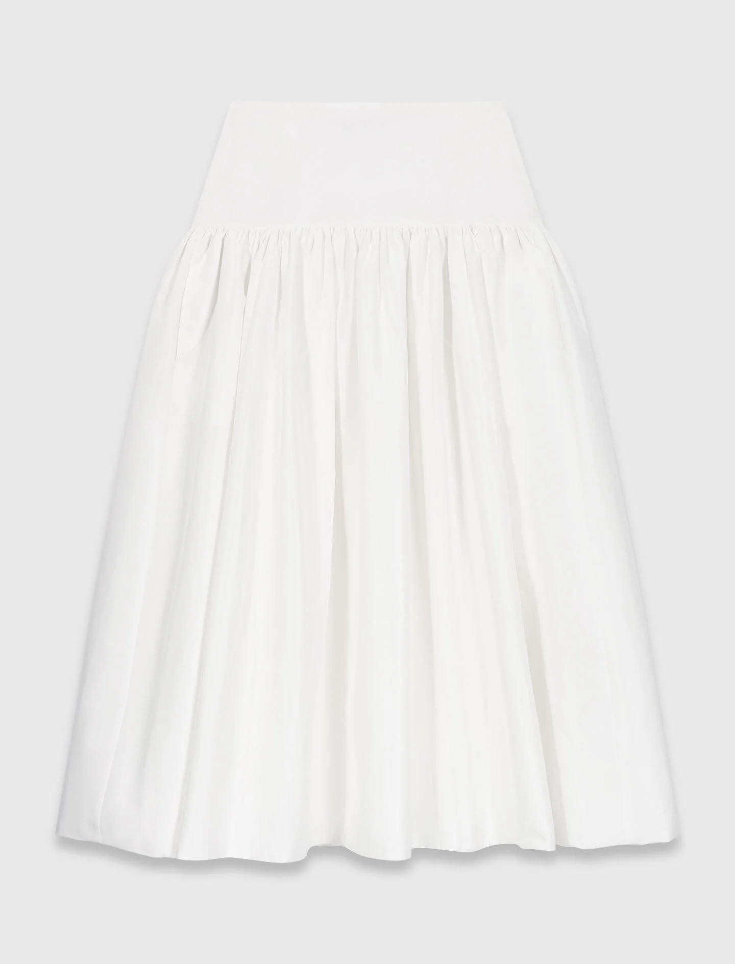 Long taffeta skirt White takes on a new dimension: clean lines, ample volumes and discreet modernity, an ode to the assertive femininity of the Maje woman. This midi skirt creates a graphic silhouette thanks to its high waist, structured by a smooth waistband that contrasts with the generous gathers below. Its flared and voluminous cut is enhanced by practical side pockets, while the matte finish highlights its minimalist and refined look. For a luminous look, pair it with a fitted knit polo shirt, heeled mules and a gold fringed bag. - Structured high-waisted flared midi skirt - Wide, flat waistband and voluminous gathers - In-seam side pockets - Discreet side zip fastening - Simple hem and matte finish - Designed for a loose fit Reference: MFPJU01595_10 Composition & care Main material: 100% polyester Lining: 100% cotton Hand wash Do not bleach Do not tumble dry Iron at a maximum temperature of 110°C without steam F/ - Professional dry clean, with hydrocarbon solvent, gentle treatment