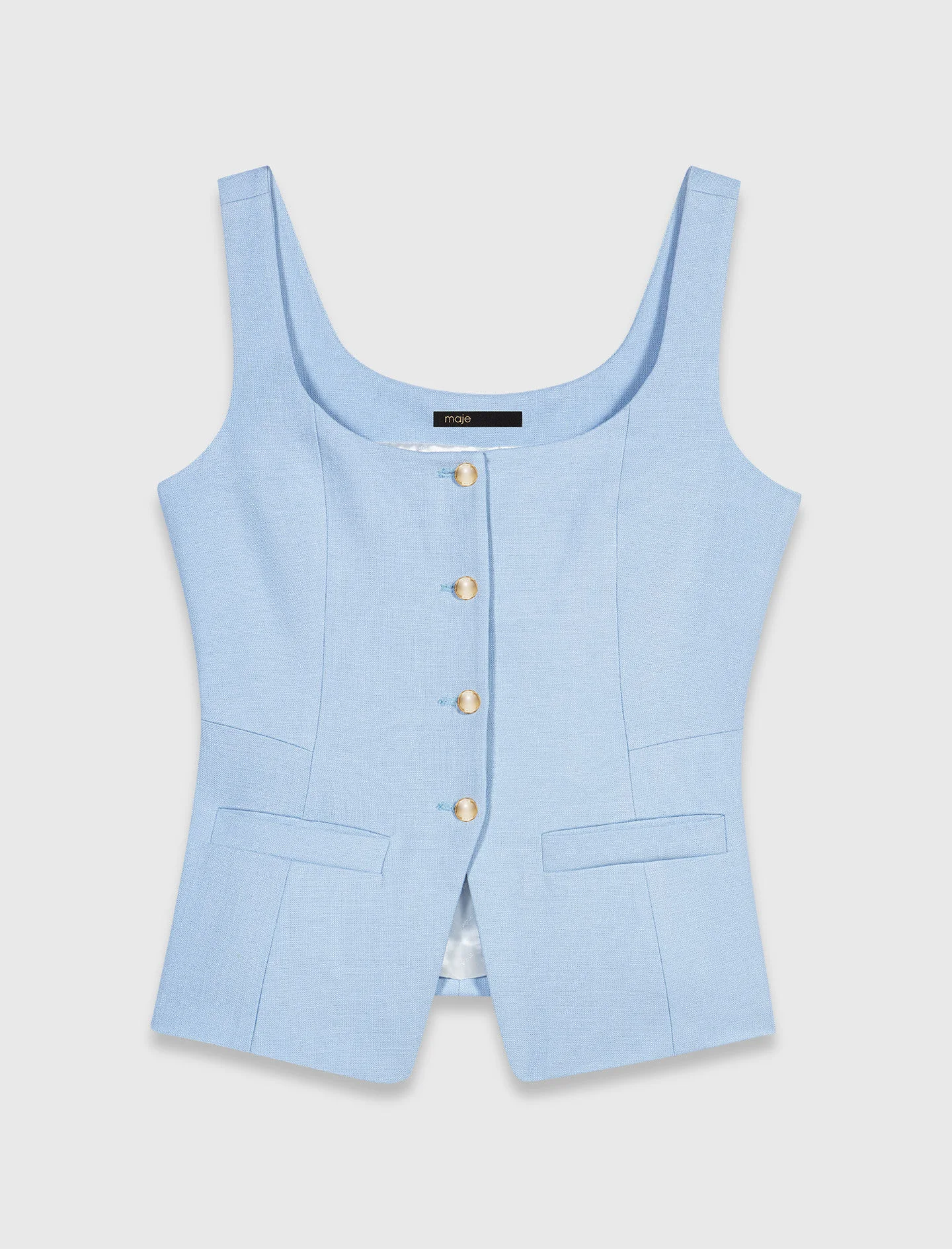 Long tailored jacket Combining assertive tailoring and Parisian chic, the Maje woman embraces a structured look that blends graphic refinement with confident femininity. This long, sleeveless waistcoat creates a fitted silhouette thanks to its princess seams and fitted cut. The square neckline, wide straps, flap pockets and four gold buttons give it a decidedly modern feel, while the white satin lining provides a luxurious finish. - Fitted waistcoat - Wide, open square neckline - Four gold-button fastening - Decorative flap pockets - Contrasting satin lining - Tone-on-tone topstitching and princess seams - Designed for a tailored fit The model is 5' 9 and wears a size FR 36. Reference: MFPTO01335_0524 Composition & care Main material: 99% viscose, 1% elastane Lining: 100% viscose Do not wash Do not bleach Do not tumble dry Iron at a maximum temperature of 110°C without steam F/ - Professional dry clean, with hydrocarbon solvent, gentle treatment