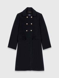 Long wool blend coat The studio creates a timeless, urban silhouette, where every detail reflects Parisian expertise. This long wool coat has a straight, slightly flared cut and captivates with its Peter Pan collar and gold buttons. Wear it over a black turtleneck jumper, a short knit skirt and leather boots for an elegant and assertive look. - Long black wool coat - Gold double-breasted fastening - Welt pockets with flaps - Domed gold buttons on the front and cuffs The model is 5' 10 and wears a size FR 36. Reference: MFPOU01441_2517 Composition & care Main material: 72% wool, 28% polyamide Lining: 100% viscose Do not wash Do not bleach Do not tumble dry Iron at a maximum temperature of 110°C without steam F/ - Professional dry clean, with hydrocarbon solvent, gentle treatment