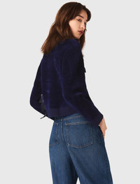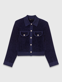 Cropped velvet jacket This season is all about soft textures and pieces with character. This corduroy jacket-style cardigan strikes the perfect balance between comfort and style. The knit collar and ribbed trims accentuate the silhouette, while its slightly loose fit gives it a casual look. Wear with balloon jeans to play with volumes, and accessorise with a printed scarf, a leather bag and chic loafers. - Cropped corduroy jacket-style cardigan - Ribbed collar and trims - Button fastening and two chest flap pockets - Designed for a standard fit The model is 5' 10 and wears a size 1. Reference: MFPCA00632_0103 Composition & care Main material: 54% viscose, 45% polyamide, 1% elastane Pocket: 91% viscose, 8% polyamide, 1% elastane Collar: 88% viscose, 11% polyamide, 1% elastane Rib: 86% viscose, 13% polyamide, 1% elastane Hand wash Do not bleach Do not tumble dry Iron at a maximum temperature of 110°C without steam F - Professional dry clean, with hydrocarbon solvent, normal treatment