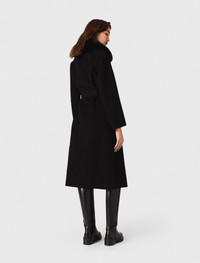 Double-faced coat with removable collar This season, Maje is reinventing seasonal essentials to wrap silhouettes in softness and modernity. A long coat with an architectural silhouette that is both fluid and soft. The double-faced wool gives it a substantial drape, while the removable faux fur collar adds a retro-chic touch. The belt accentuates the waist for a feminine, structured and timeless look. Wear with an ecru round-neck knit jumper and high black riding-style boots. - Long double-faced wool coat - Removable faux fur collar - Waist belt with jewelled buckle - Concealed button fastening - Designed for a standard fit The model is 5' 10 and wears a size 36. Reference: MFPOU01409_2517 Composition & care Main material: 80% wool, 20% polyamide Faux fur: 100% polyester Collar lining: 100% polyester Do not wash Do not bleach Do not tumble dry Iron at a maximum temperature of 110°C without steam F/ - Professional dry clean, with hydrocarbon solvent, gentle treatment