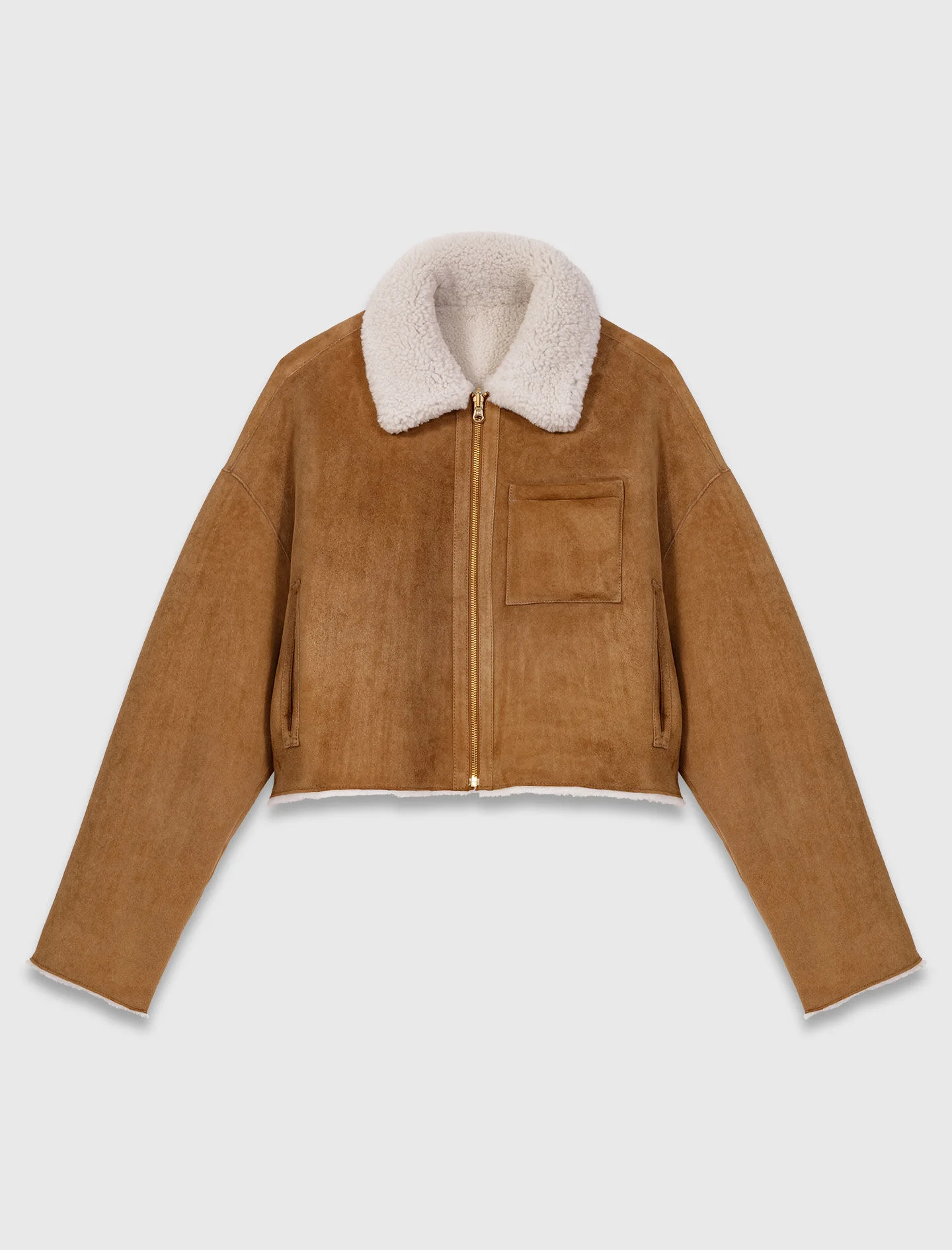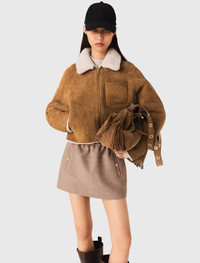 Reversible shearling coat For this new season, Maje has designed statement pieces to enhance your style. This reversible sheepskin jacket plays on contrasts: an ultra-soft furry lining and a decidedly modern cut. With a zip fastening and long sleeves, it can be worn on the suede side or the furry side, offering multiple styles. Add a short skirt and signature accessories like a fringed bag and a helmet to complete the look. - Short reversible sheepskin jacket - Furry lining - Zip fastening - Fur Type: Sheep - Fur Origin: Turkey - Dyed - Designed for a cropped, boxy fit The model is 5' 11 and wears a size 36. Reference: MFPOU01395_0067 Composition & care Main material: lambskin leather Pocket lining: 100% cotton Do not wash Do not bleach Do not tumble dry Do not iron Do not dry clean