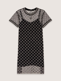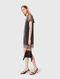 Mini embroidered tulle dress Made from tulle, this mini dress features embroidery with white, transparent, round and tubular beads, catching the light. The neck and short sleeves are trimmed with beaded braid, and the removable lining with thin straps means you can choose just how sheer you prefer it. Perfect for a glitzy evening look, team with a pair of pumps for total elegance. - Sheer tulle mini dress - Round and tubular bead embroidery - Short sleeves - Bead-embroidered trim - Buttoned peephole at the back - Removable lining with thin straps - Designed for a loose fit The model is 5' 10 and wears a size FR 36. Reference: MFPRO04009_2517 Composition & care Main material: 100% polyester Yoke: 53% polyester, 47% polyamide Interior grosgrain: 100% cotton Removable lining: 100% viscose Regular cycle 30° Do not bleach Do not tumble dry Do not iron Do not dry clean