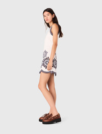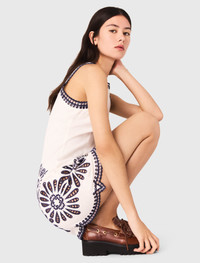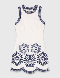 Mini dress with crochet details The studio takes us to Italy, from Milan to Lake Como, for a new take on classic elegance and femininity. A dolce vita style with a touch of humour and plenty of glamour, as always. This short, sleeveless dress features contrasting embroidered flowers and scalloped edges. Elegant and structured, it can be worn on its own or layered with matching trousers and wedge sandals. - Sleeveless short dress - Contrasting details - Flower crochet details - Designed for a standard fit Reference: MFPRO04505_O025 Composition & care Main material: 98% cotton, 2% elastane Embroidery: 100% polyester Regular cycle 30° Do not bleach Do not tumble dry Iron at a maximum temperature of 110°C without steam F - Professional dry clean, with hydrocarbon solvent, normal treatment