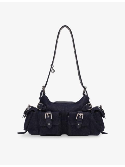 PRODUCT DETAILS - Maje denim shoulder bag - 100% cotton - Buckle fastening - Adjustable shoulder strap with silver-tone eyelets, sheathed double handle, logo embossed at the front, two buckle pockets at the front and side, clover charm - Height 19cm, width 16cm, depth 8cm - Do not wash Ref: R04490315