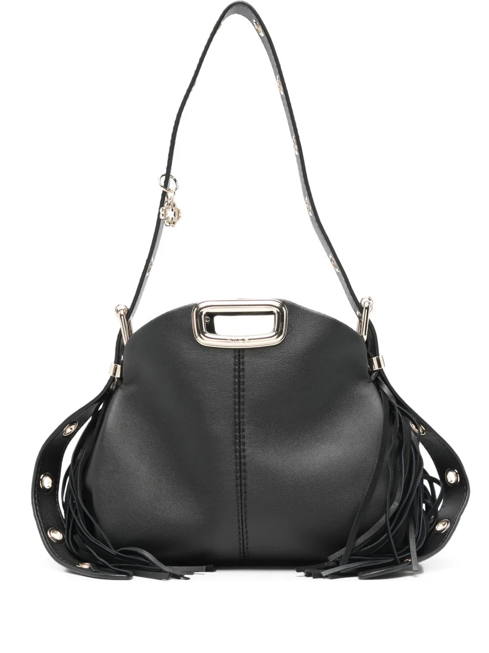 Miss M fringe hardware shoulder bag Highlights - Black - Metal top handle - Shoulder strap - Fringe detailing - Hardware detailing - Buckle fastening strap Imported Composition Outer: Lambskin 100%, Zamak 100% Lining: Polyester 100% SIZE & FIT Model measurements Height 5 ft 10 in(1.78 m) Bust/Chest 31.49 in(80 cm) Hips 37 in(94 cm) Waist 23.62 in(60 cm) Measurement DEPTH 3.93 in(10 cm) HEIGHT 7.08 in(18 cm) WIDTH 9.44 in(24 cm)