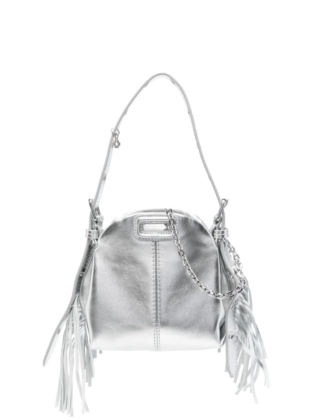 Miss M metallic micro bag Highlights - Silver-tone - Open top - Adjustable shoulder strap - Fringed edge Imported Composition Outer: Calf Leather 100% SIZE & FIT Model measurements Height 5 ft 9 in(1.75 m) Bust/Chest 32.67 in(83 cm) Hips 36.22 in(92 cm) Waist 24.8 in(63 cm) Measurement DEPTH 2.75 in(7 cm) HEIGHT 5.9 in(15 cm) WIDTH 7.48 in(19 cm)