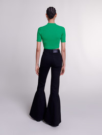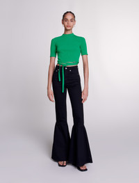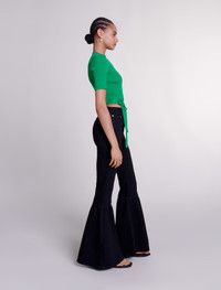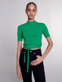 Knit crop top with ties Bold tailoring and feminine details: the studio has come up with a wardrobe of essentials, where iconic pieces embody timeless elegance to uplift your seasonal outfits. Both chic and daring, this rib knit crop top comes in a bright green to uplift your look. With short sleeves and a high neck, the waist is accentuated with an embroidered and metallic Clover detail, and tie details that you can tie to suit you. - Rib knit crop top - Embroidered Clover detail - Waist ties The model is 5' 9 and wears a size 1. Reference: MFPPU00771_09 Composition & care Main material: 56% viscose, 42% polyamide, 2% elastane Waistband: 57% viscose, 41% polyamide, 2% elastane Hand wash Do not bleach Do not tumble dry Iron at a maximum temperature of 110°C without steam Do not dry clean
