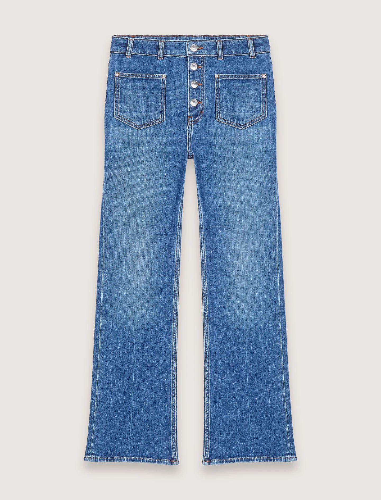 Denim jeans with pockets Straight-cut jeans, slightly flared at the bottom. Slightly faded denim fabric, frayed at the bottom. Back pockets and patch pockets on the front with Maje Clover metal rivets. Visible metal buttons on the front with Maje logo. Maje Clover label. Can be worn with this season’s T-shirts. - Straight-cut jeans - Maje Clover rivets - Frayed at the bottom Reference: MFPJE00856_0201 Composition & care Main material: 99% cotton, 1% elastane Jacron: calfskin leather Regular cycle 30° Do not bleach Do not tumble dry Iron at a maximum temperature of 110°C without steam F - Professional dry clean, with hydrocarbon solvent, normal treatment